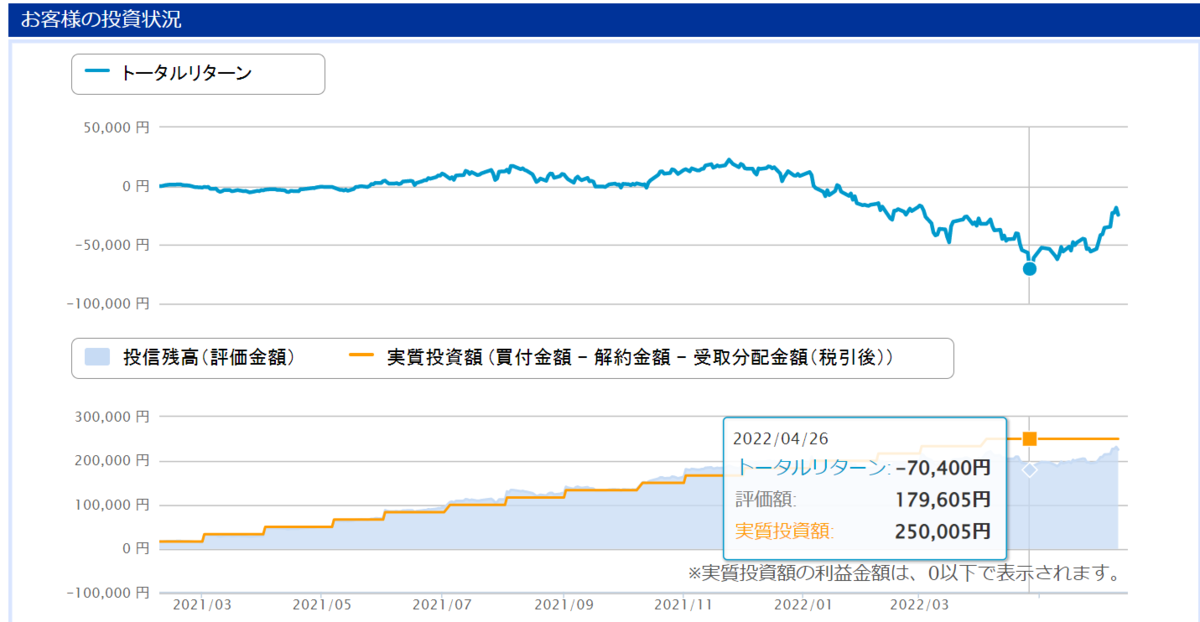 一番ヒドイときでは、2022/4/26にリターンがマイナス7万円となっていました。入金額25万に対して28%のマイナスです。辛い!!
