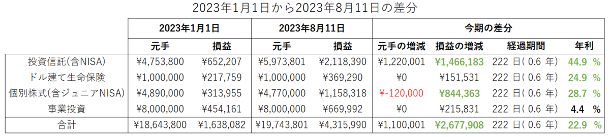 今期(2023年上期)の期間は、正月2023年1月1日からお盆2023年8月11日です。日数は222日(0.6年間)です。