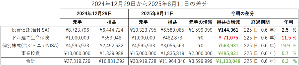 - 今期(2024年12月29日~2025年8月11日)は元手3091万、+113万、年利換算6.3%でした。